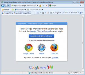 Also Google surrenders to Internet Explorer compatibility.Here it is what it looks like if you try to use Google Wave on IE. It's asked to install a plug-in. The Chrome Frame that uses the chrome engine to render the all pages...